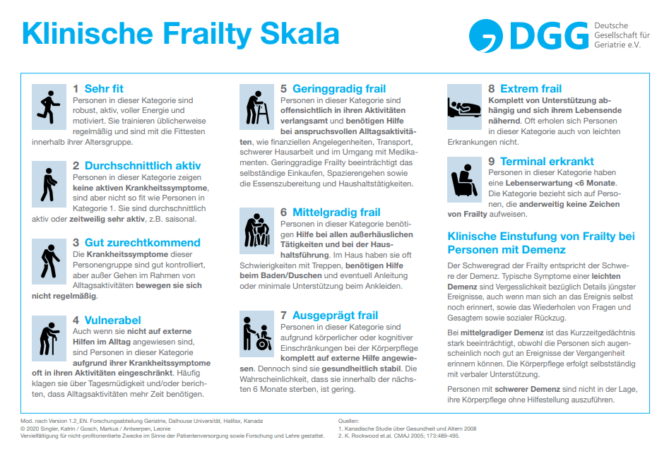 Die Klinische Frailty Skala (CFS) sieht eine Einschätzung des vorliegenden Gesundheitszustandes eines Menschen in 9 Kategorien vor.